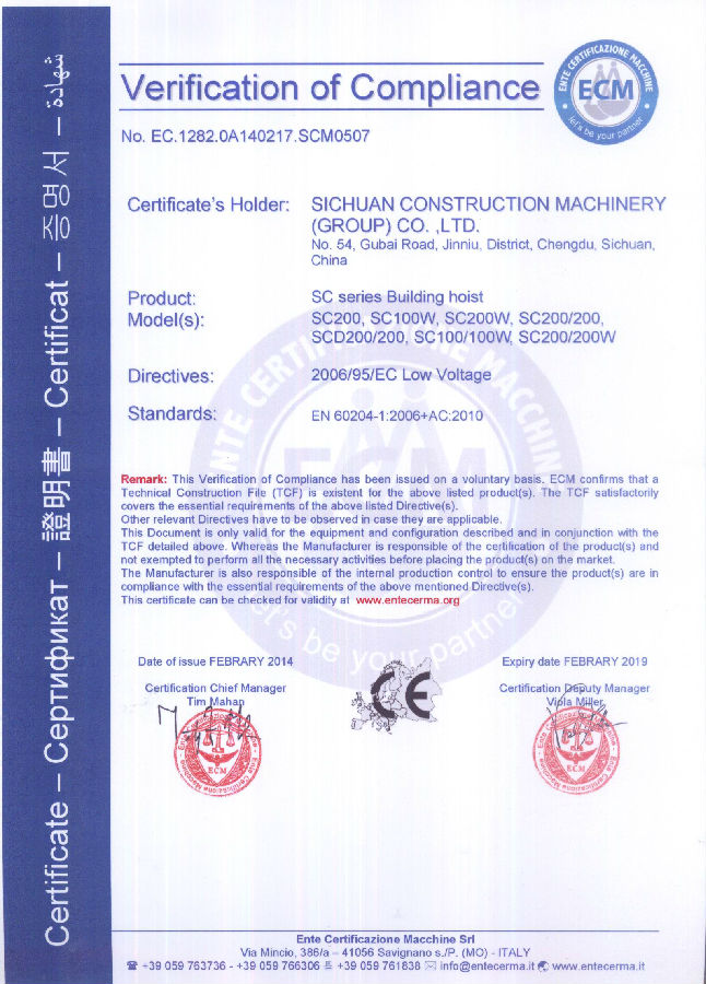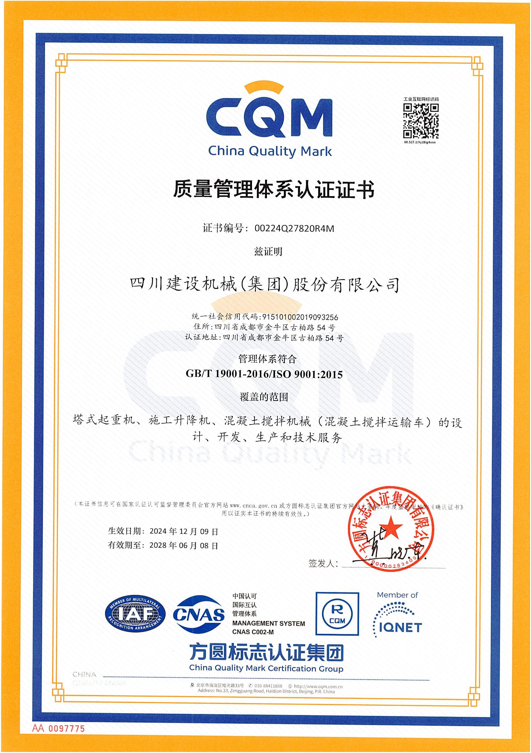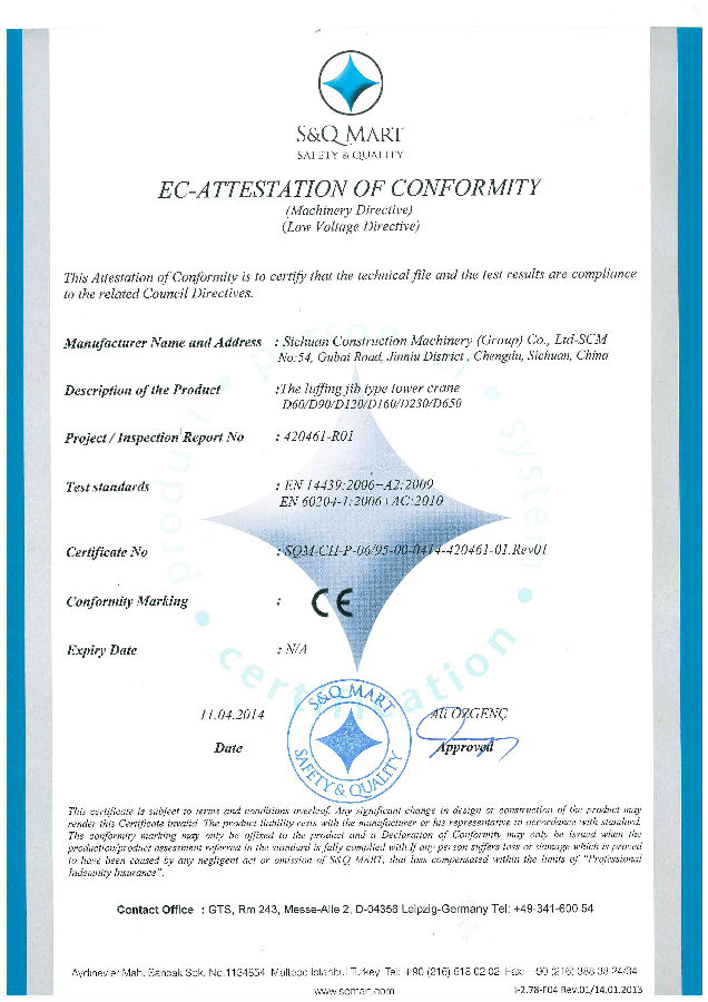 順利通過ISO9001國際質量體系認證,體系覆蓋產品:塔機、施工梯、混凝土攪拌機、膠印機系列產品;