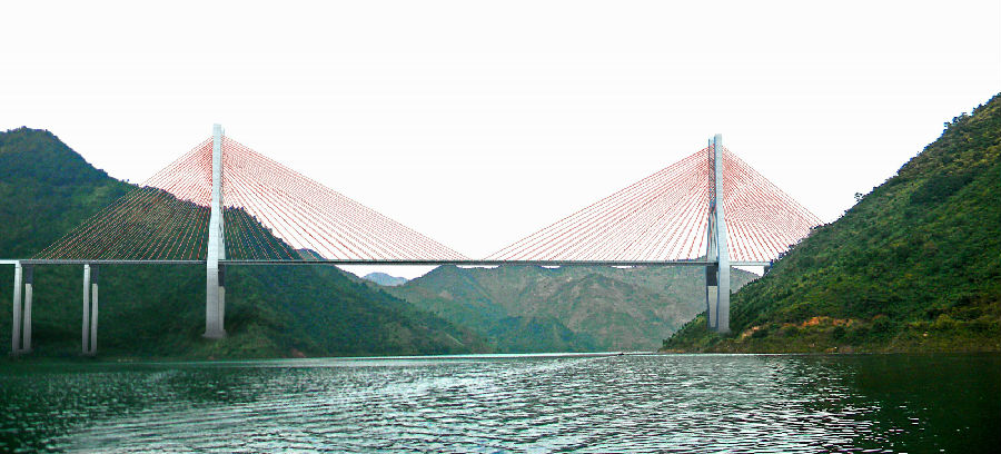 紅水河特大橋橋長(zhǎng)956米,引橋設(shè)計(jì)為2×20米預(yù)應(yīng)力混凝土現(xiàn)澆箱梁,主橋設(shè)計(jì)為貴州岸邊跨213米,主跨508米,廣西岸邊跨185米的雙塔雙索面混合式疊合梁斜拉橋,結(jié)構(gòu)設(shè)計(jì)形式新穎。橋面寬27.7m,為雙向四車道高速公路。設(shè)計(jì)速度每小時(shí)80公里,總投資5.46億元,由廣西路橋公司承建。大橋在施工中利用斜拉橋主塔本身安裝纜索吊裝系統(tǒng),以纜索吊裝鋼主梁及疊合預(yù)制橋面板作為一種拉索體系,使橋梁受力更加合理化,施工更加便捷,相比傳統(tǒng)梁式橋、拱橋具有更大的跨越能力。
