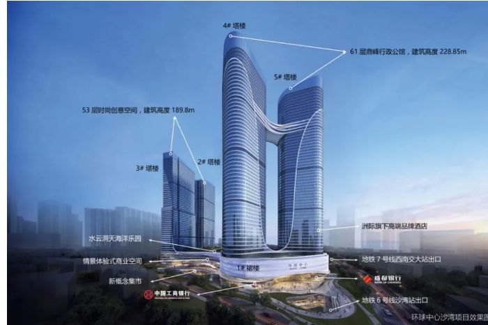 項目由3層商業(yè)裙樓(局部4層)及4棟超高層塔樓組成,最高塔樓高達243米,被譽為“摩天雙子塔,標(biāo)定時代天際線”、“新世紀(jì)·成都高端峰寓范本,當(dāng)代高階天幕藝術(shù)品,全球一線臻裝選材”,是成都市西北新地標(biāo)建筑。