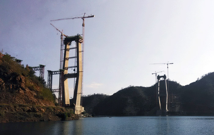 項(xiàng)目地點(diǎn):貴州紅水河特大橋兩側(cè)橋墩高度均為210米,每個(gè)橋墩的起重機(jī)械配置均為川建生產(chǎn)的一臺(tái)C7036塔機(jī)、一臺(tái)C7030塔機(jī)和兩臺(tái)SC200/200WPZ中速變頻施工梯,副墩的施工機(jī)械為一臺(tái)P125平頭式塔機(jī)。